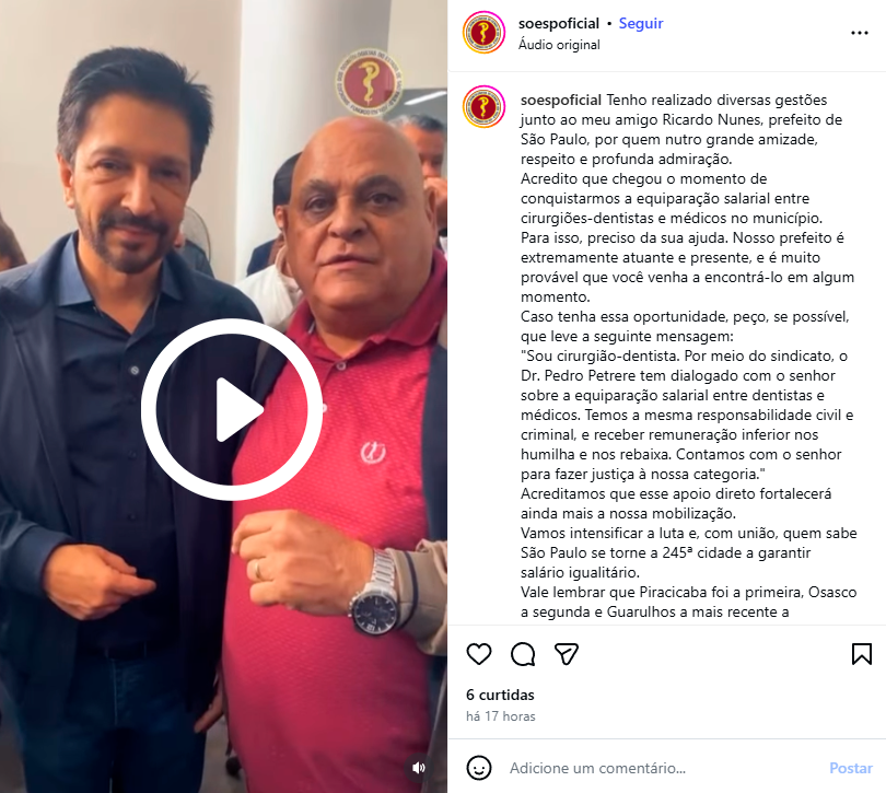 Tenho realizado diversas gestões junto ao meu amigo Ricardo Nunes, prefeito de São Paulo, por quem nutro grande amizade, respeito e profunda admiração. Acredito que chegou o momento de conquistarmos a equiparação salarial entre cirurgiões-dentistas e médicos no município.